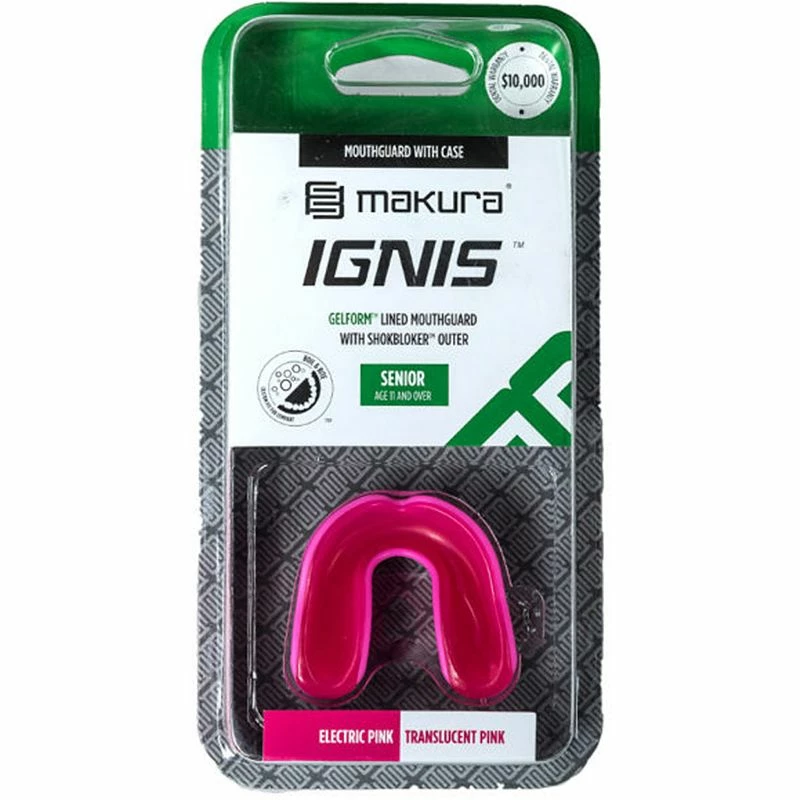 HetΒ Indian Maharadja Makura Ignis BitjeΒ is een gebitsbeschermer afkomstig uit de Indian Maharadja collectie. Het dragen van een bitje kan van groot belang zijn wanneer je een bal of stick in je gezicht krijgt. Door het verdelen van de druk worden kwetsbare tanden beschermd en kan de schade aan het gebit beperkt of zelfs voorkomen worden. Het Ignis bitje is voorzien van een geavanceerde demping technologie waardoor er goede schokabsorptie is zonder dat de ademhaling wordt belemmerd. Het bitje heeft twee lagen, waarvan de binnenste een gellaag is. Het bitje kan makkelijk op maat gemaakt worden doormiddel van de Boil&Bite pasvorm.